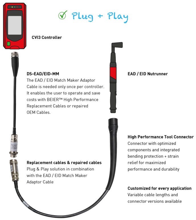 In our BEIER™ EAD / EID Match Maker Adaptor Cable, we only use the original CVI3 controller connector including the circuit board from Desoutter OEM cables.
